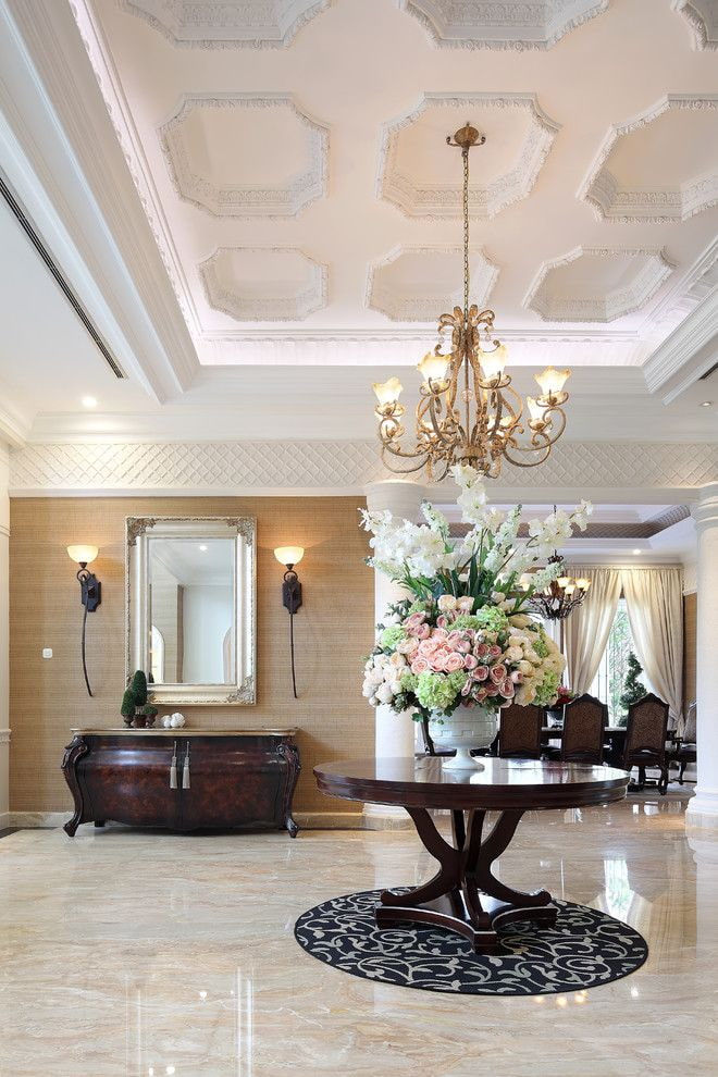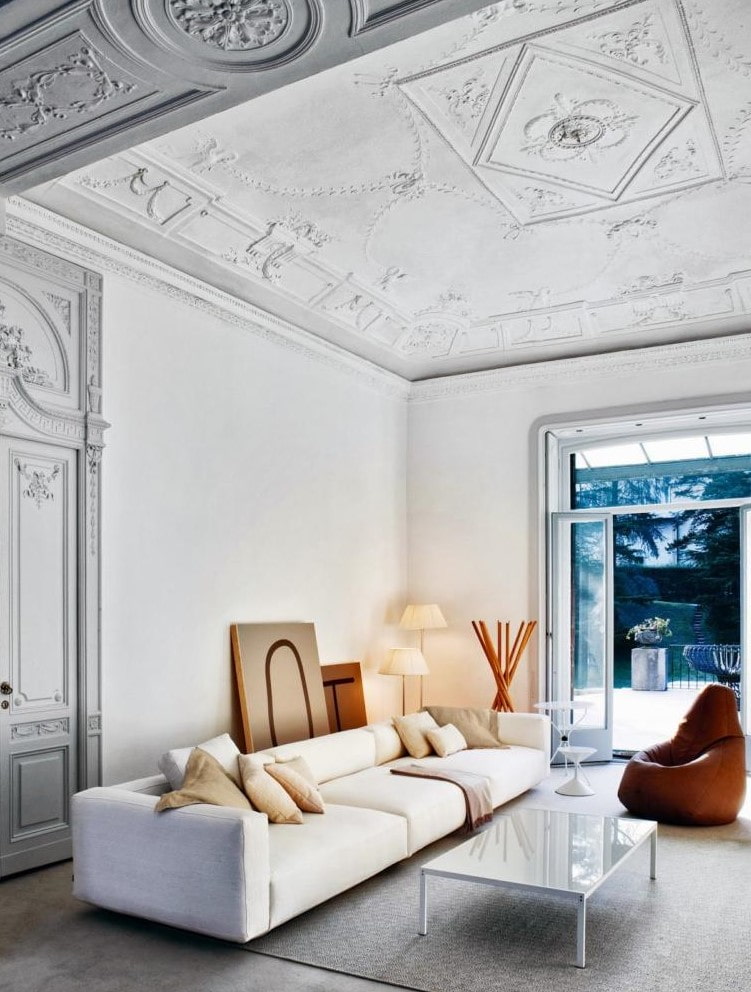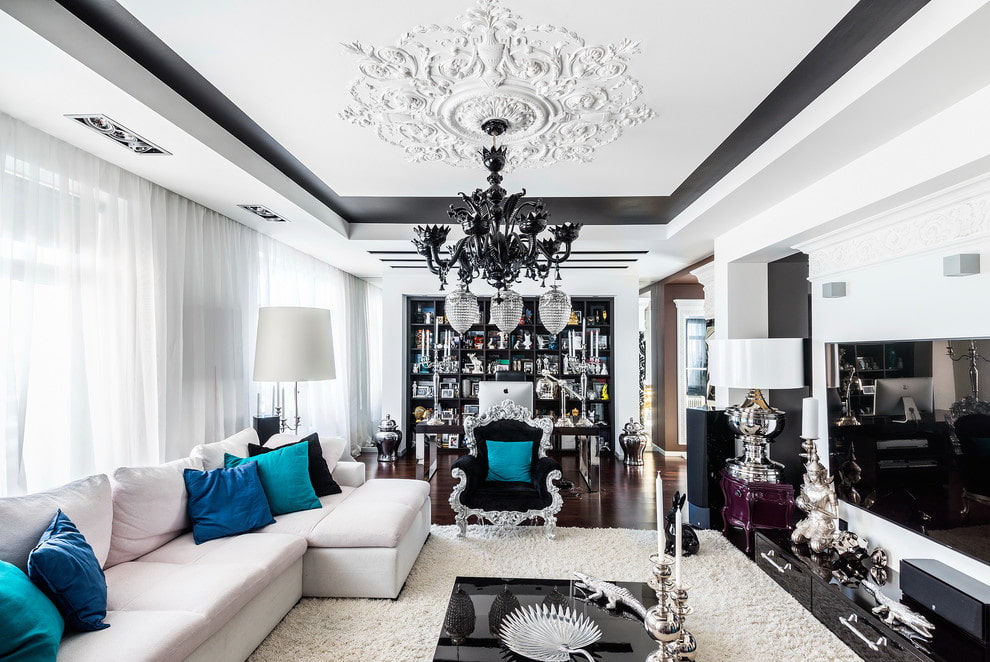 The plane of the ceiling, decorated with stucco molding, is otherwise called a plafond and is an attribute of luxury. This design solution makes the decor more original and gives it visual beauty.
