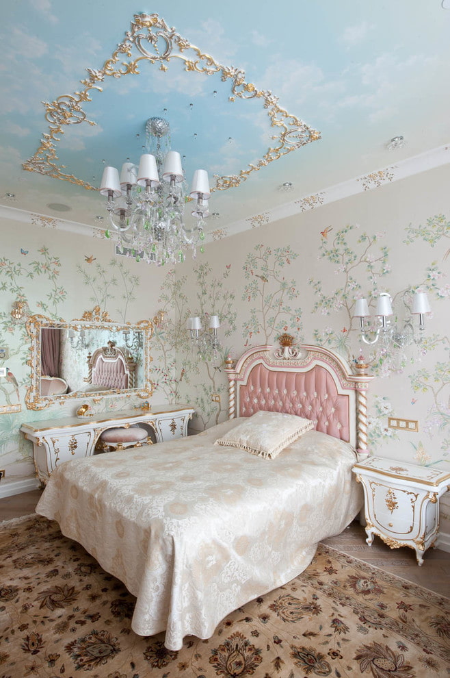 In the photo there is a bedroom with a ceiling decorated with gilded stucco.