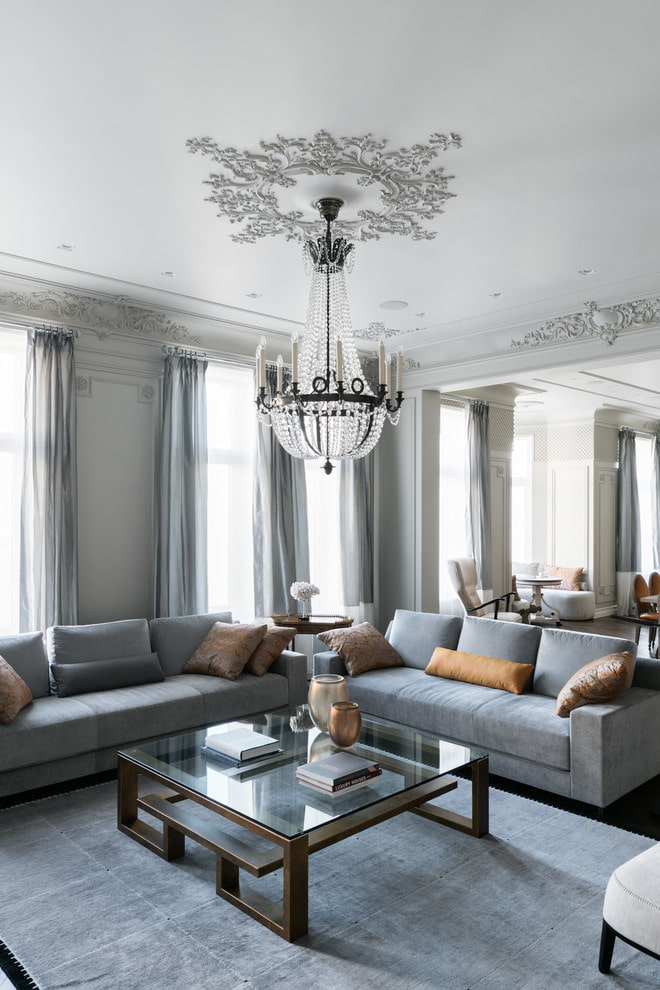 In the photo there is a stucco molding on the ceiling in the interior of the living room in a classic style.