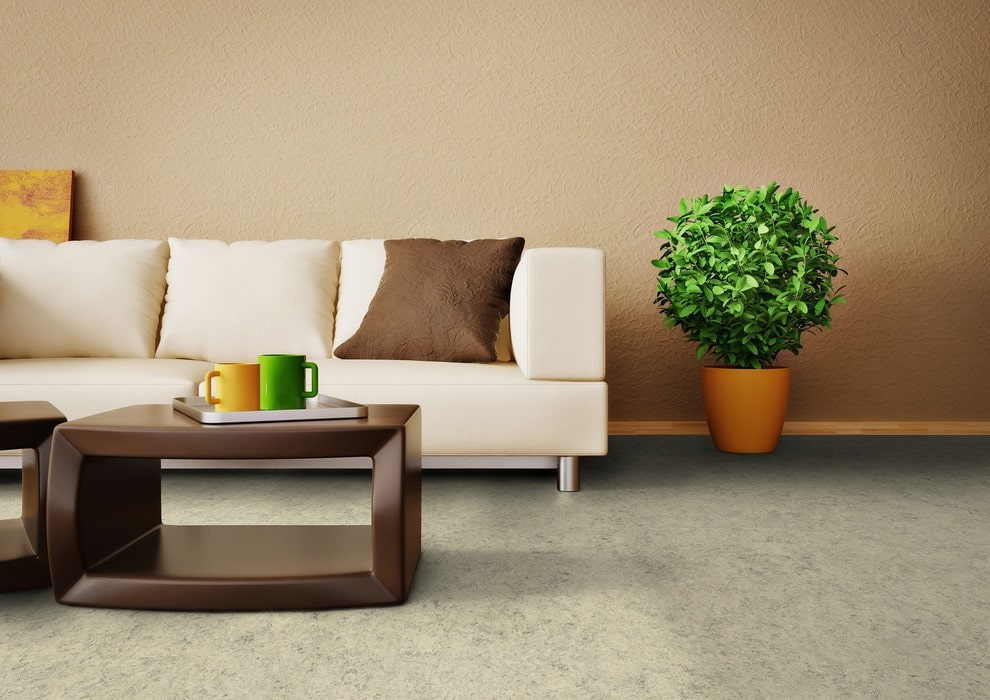 In the photo there is a living room with a floor lined with linoleum in gray-beige tones.