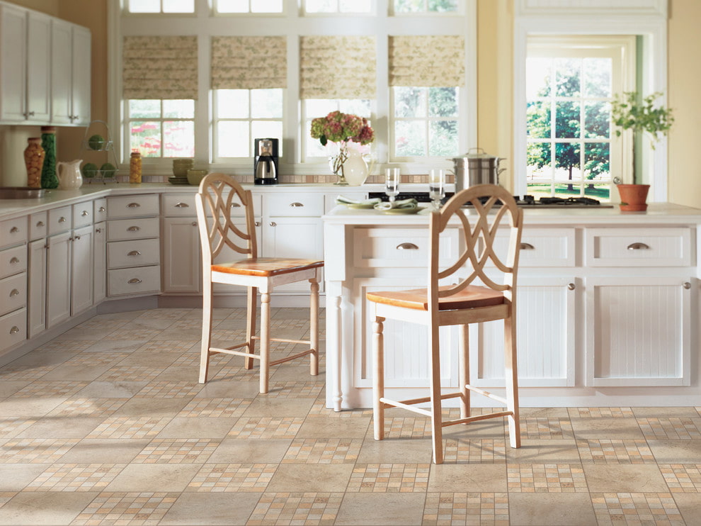 In the photo there is a floor with white linoleum in the interior of the kitchen-dining room, made in light colors