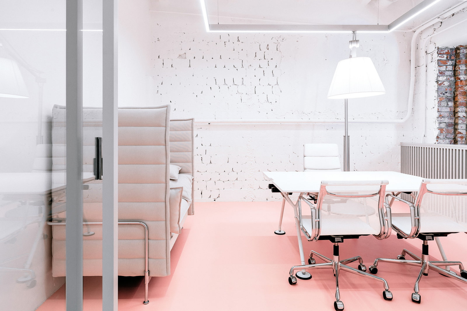The photo shows the interior of the office with a floor decorated with green linoleum.