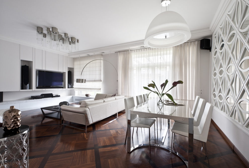 - In order for the flooring to stand out against the general interior background, it must have a more intense and contrasting design compared to furniture and wallpaper.