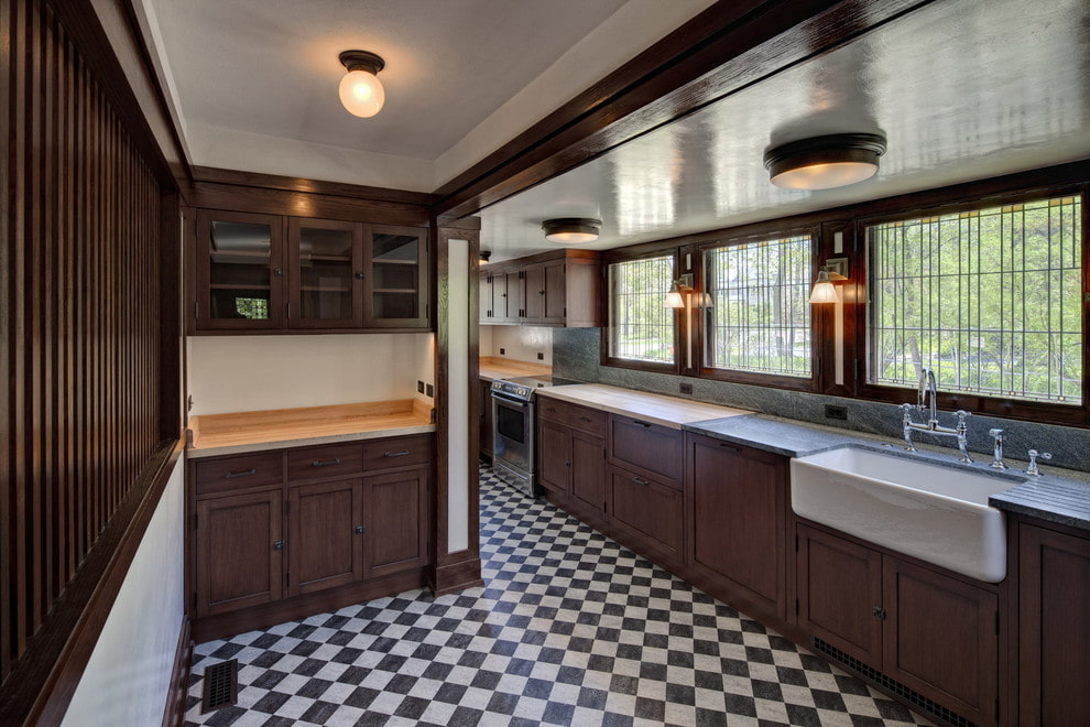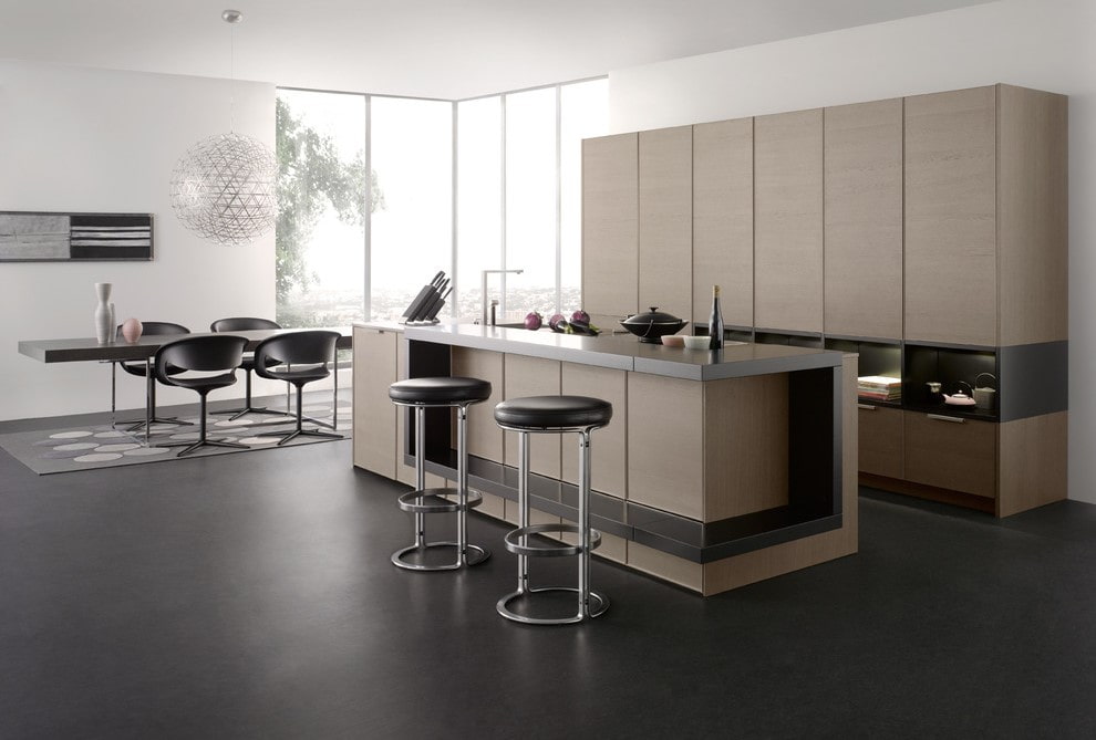 In the photo there is a spacious kitchen with a floor decorated with dark matte black linoleum.