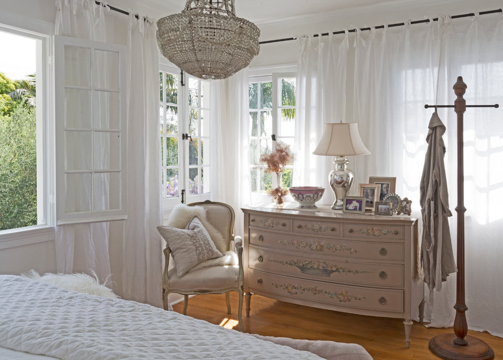 Light plain curtains or canvases decorated with flowers, embroidery, hemstitching, ruffles and lace trims will be appropriate for this style.