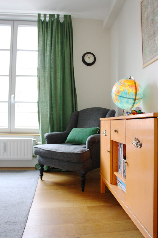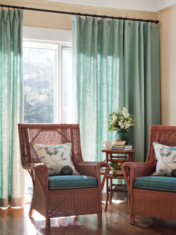 Curtains of this color cool the interior and bring refreshing and invigorating colors to it.
