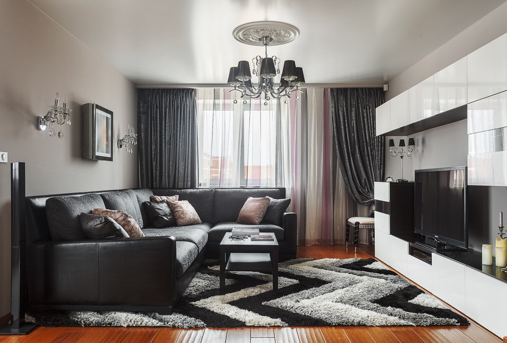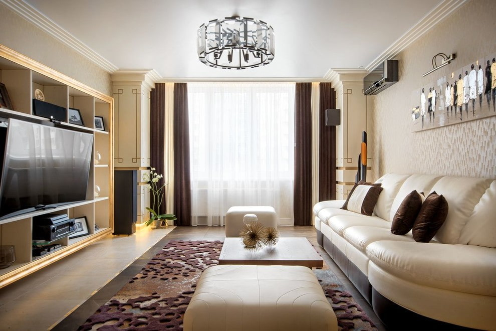 For a small living room, it is better to choose a neat and elegant lamp without unnecessary decor. In an elongated and narrow room, symmetrical placement of two small light sources will be appropriate.