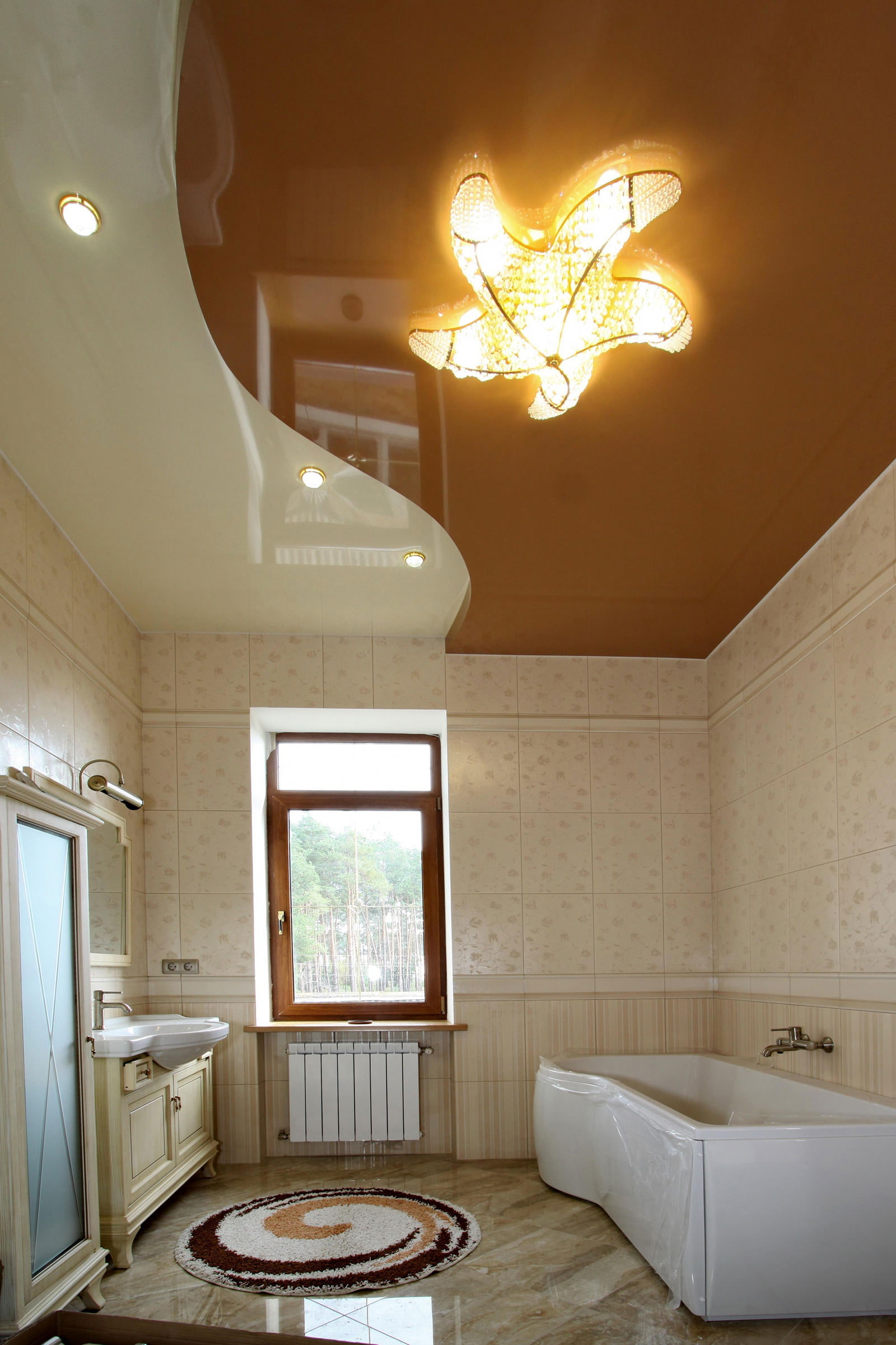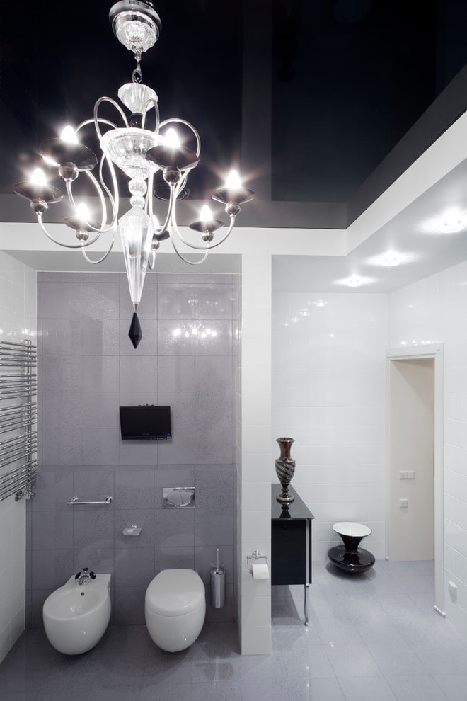 The photo shows a chandelier for a stretch ceiling in the interior of a bathroom.