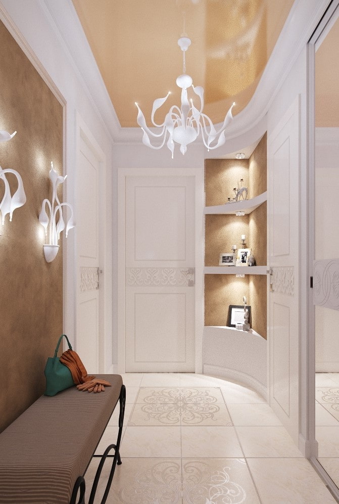 The photo shows a stretch ceiling structure with a white chandelier and spotlights in the hallway.