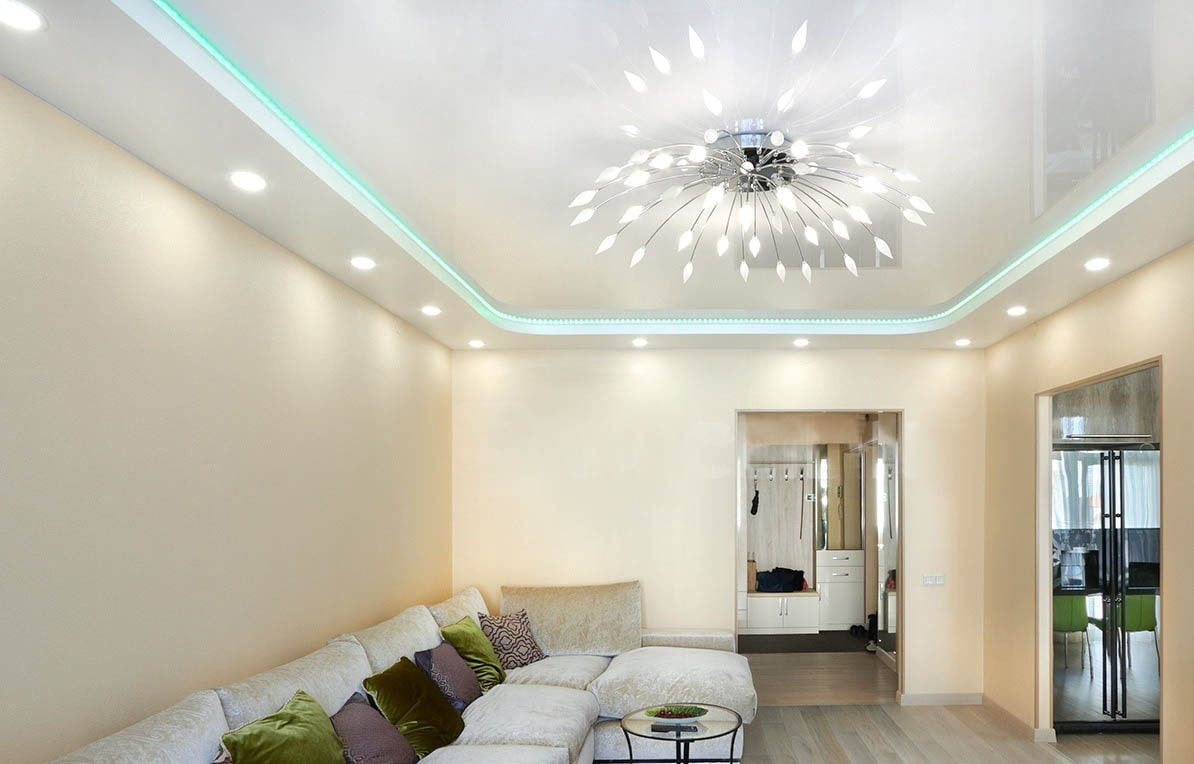 The photo shows a chandelier on a two-level stretch ceiling in the interior of the living room.