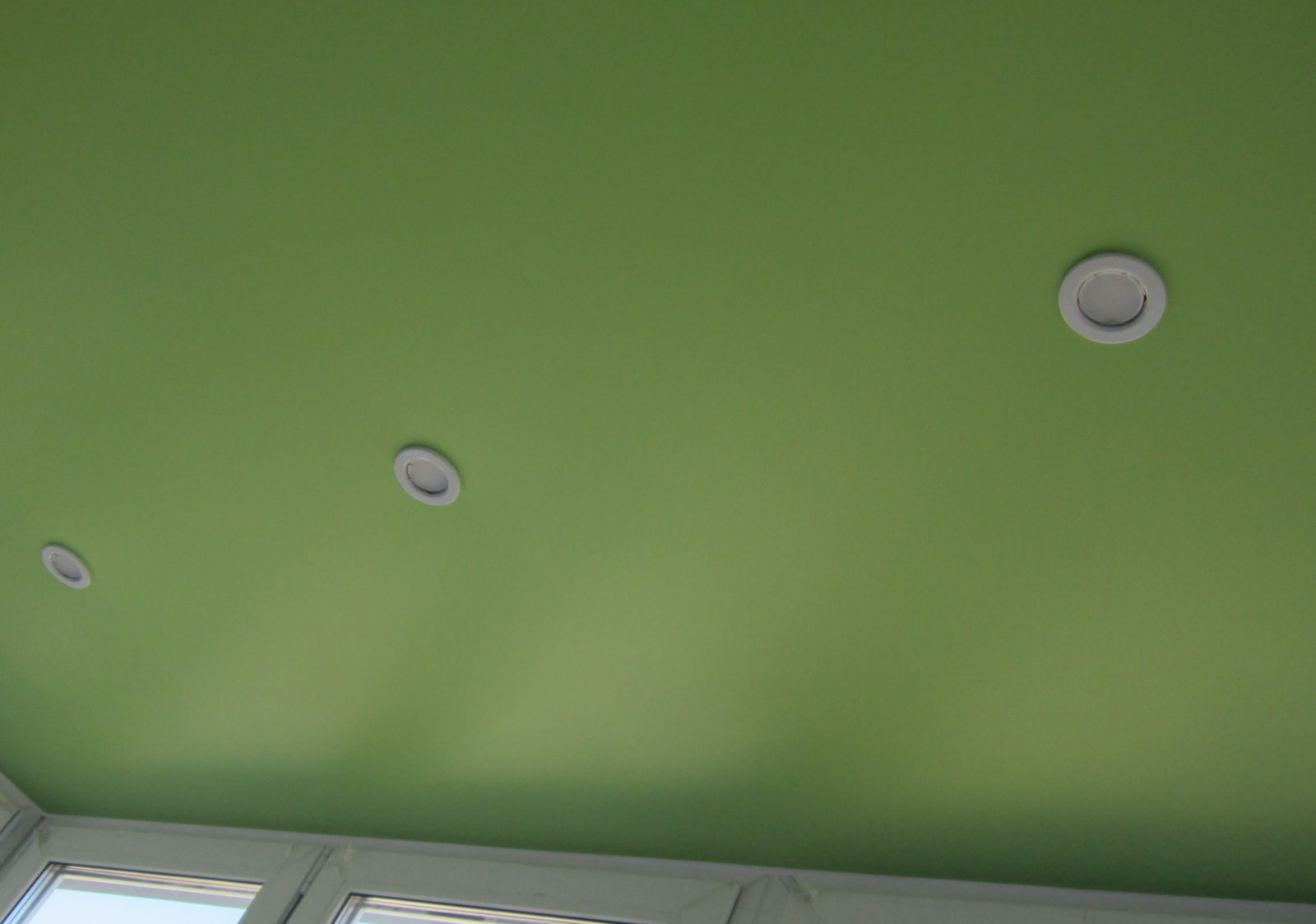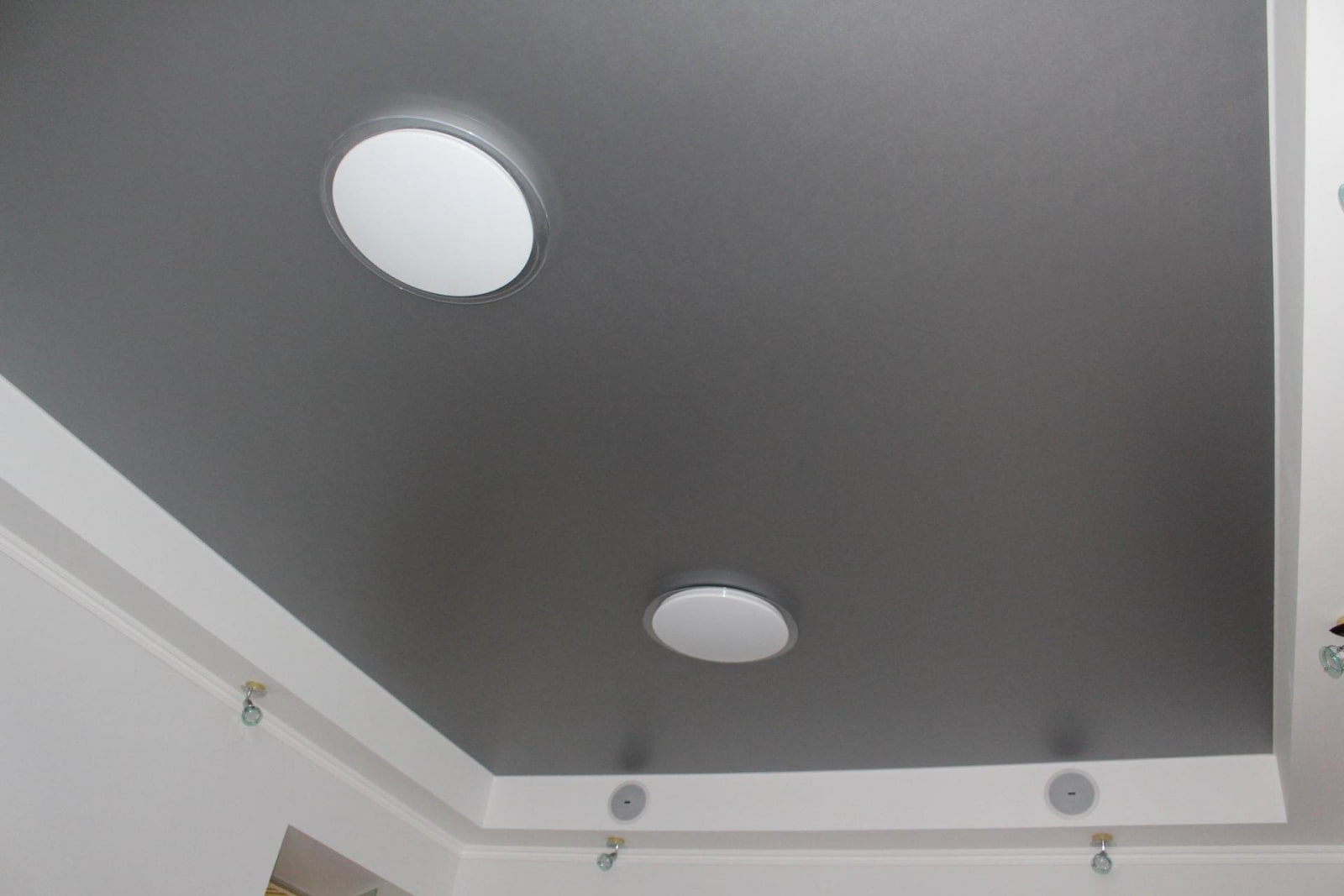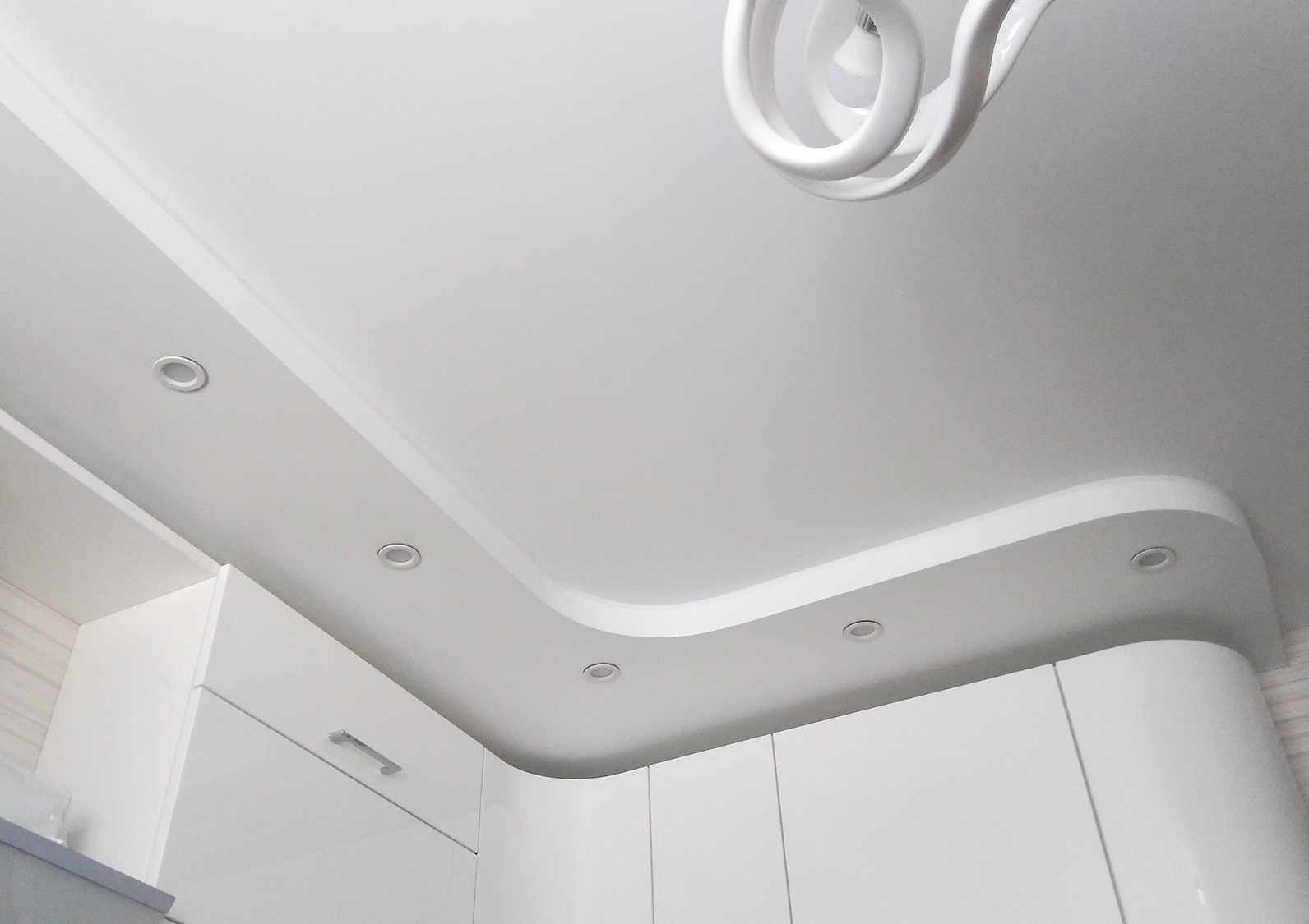 The photo shows a white matte ceiling, decorated with spots of the same color.