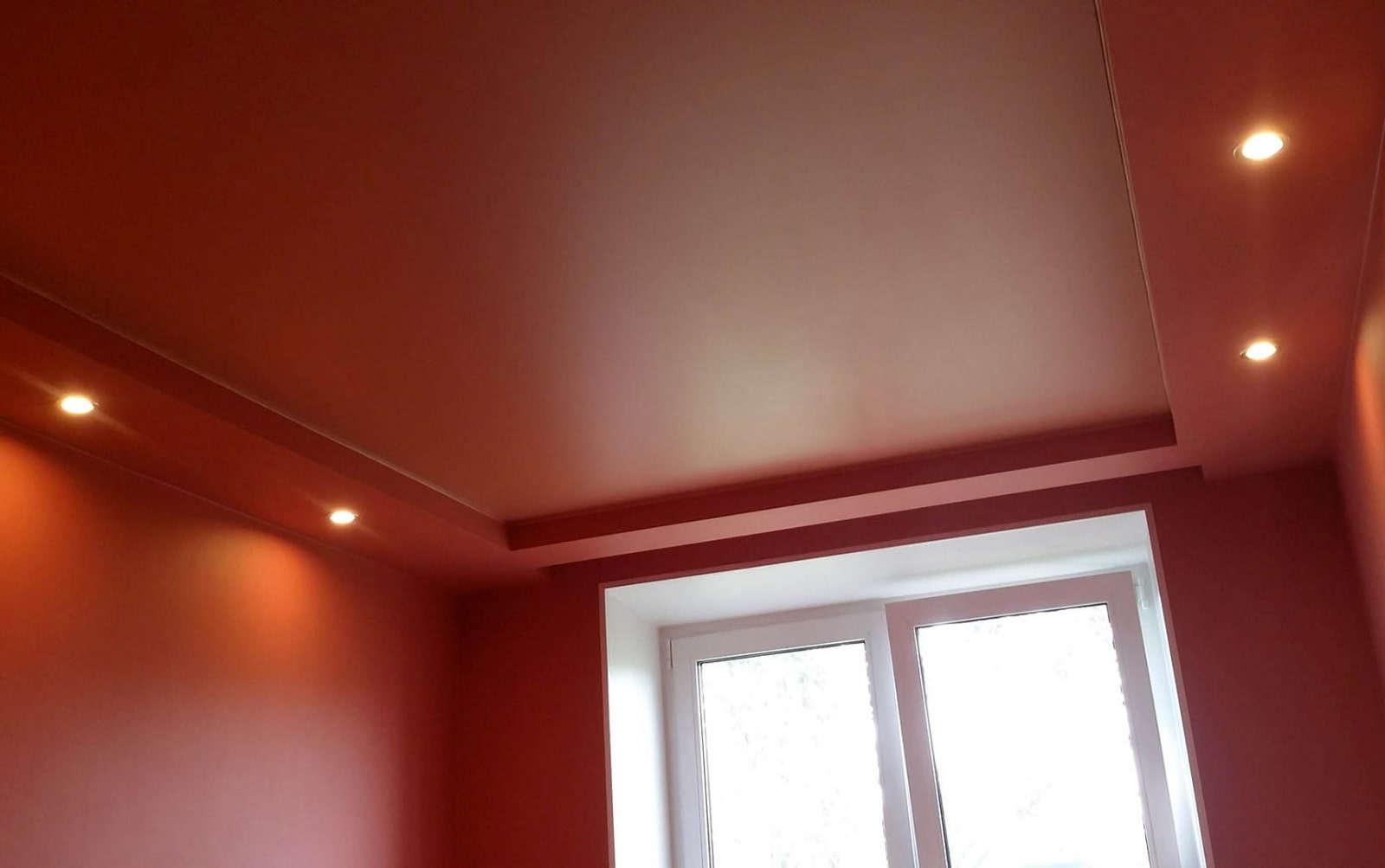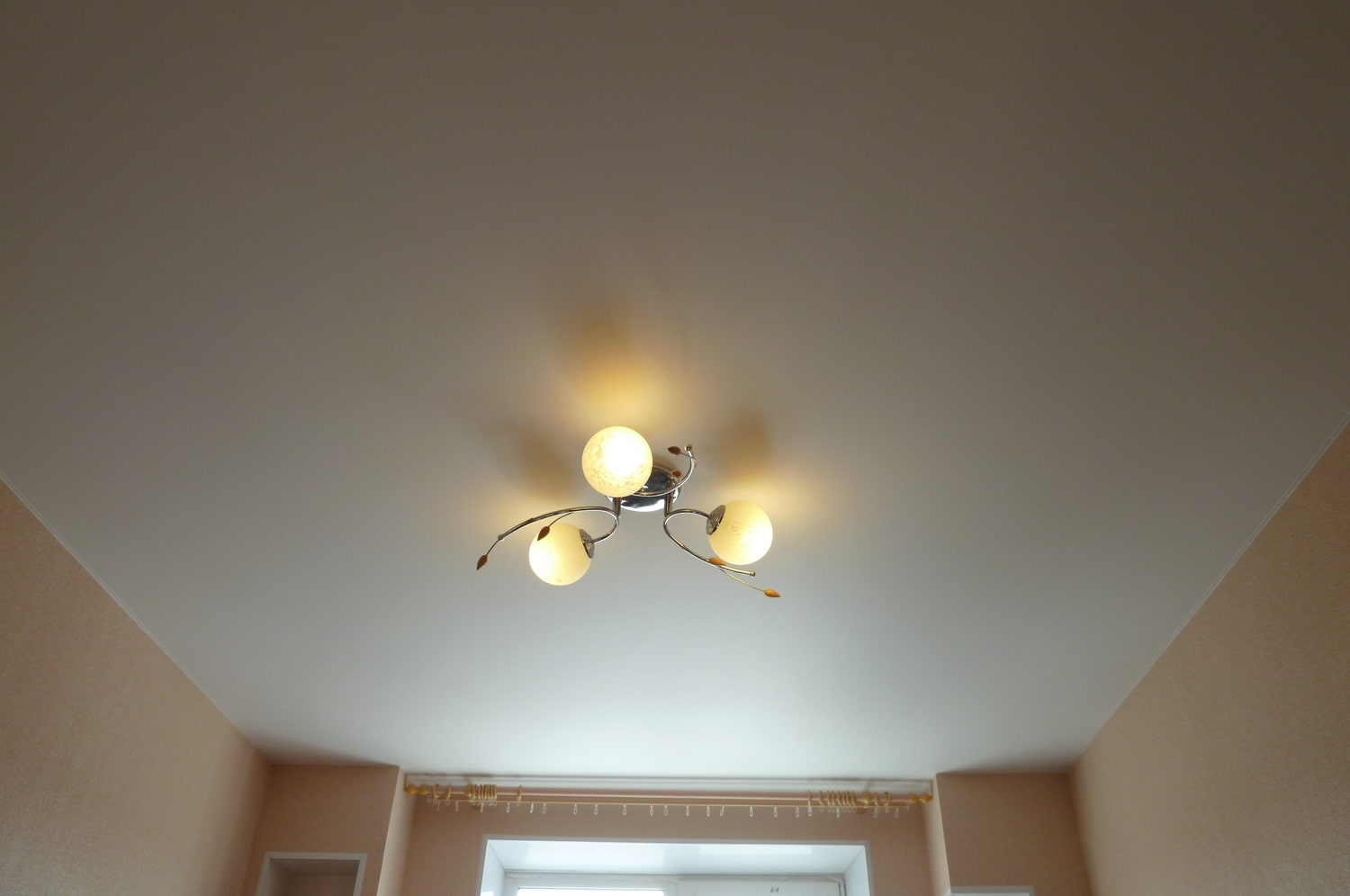The photo shows a matte peach stretch ceiling.