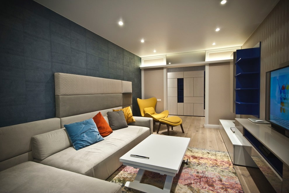 - Two-level. Visually draws attention to itself, and also helps to highlight the merits and hide the imperfections of the room.