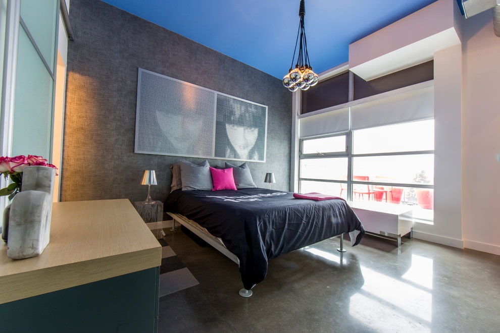 In the photo there is a bedroom interior with a matte pink ceiling.