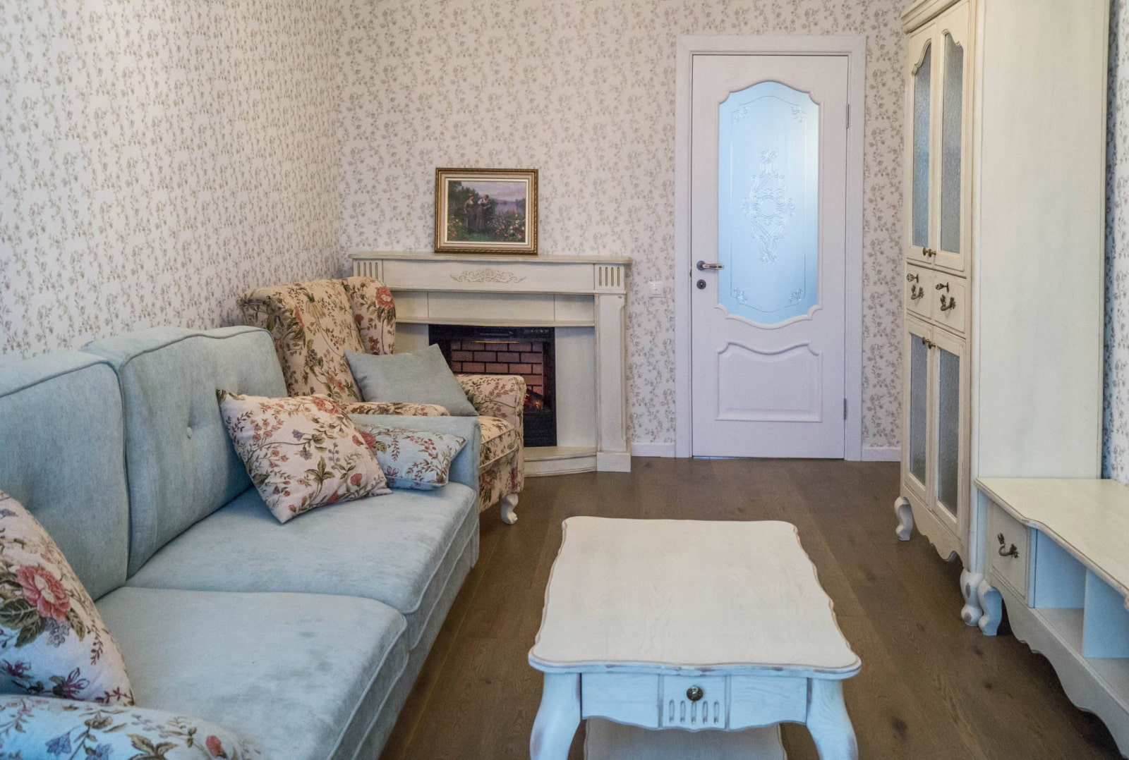 In the photo there are white interior sliding doors with frosted glass in the living room.