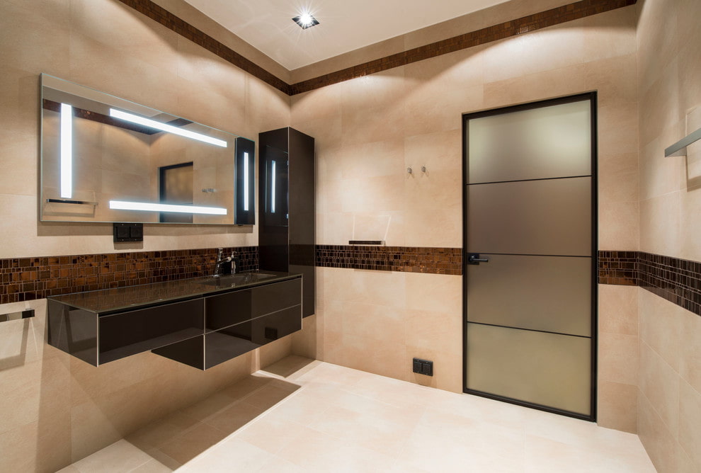 The photo shows a modern bathroom with an interior linen decorated with white glass.