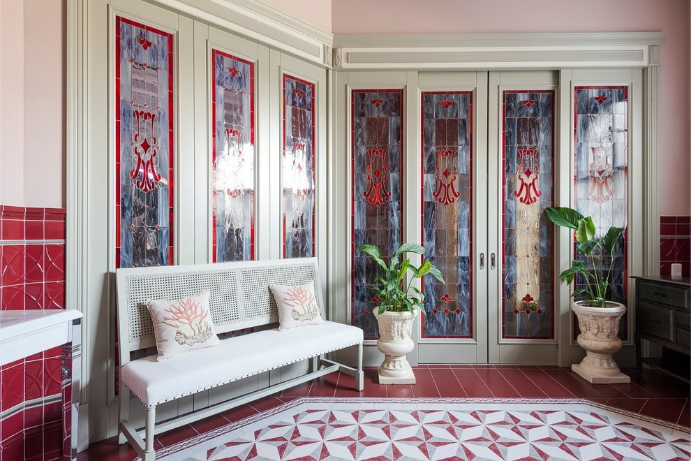 In the photo there is a hall and interior sliding doors with stained glass made using the fusing technique.
