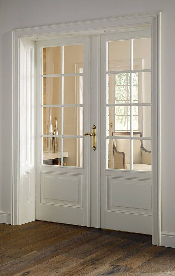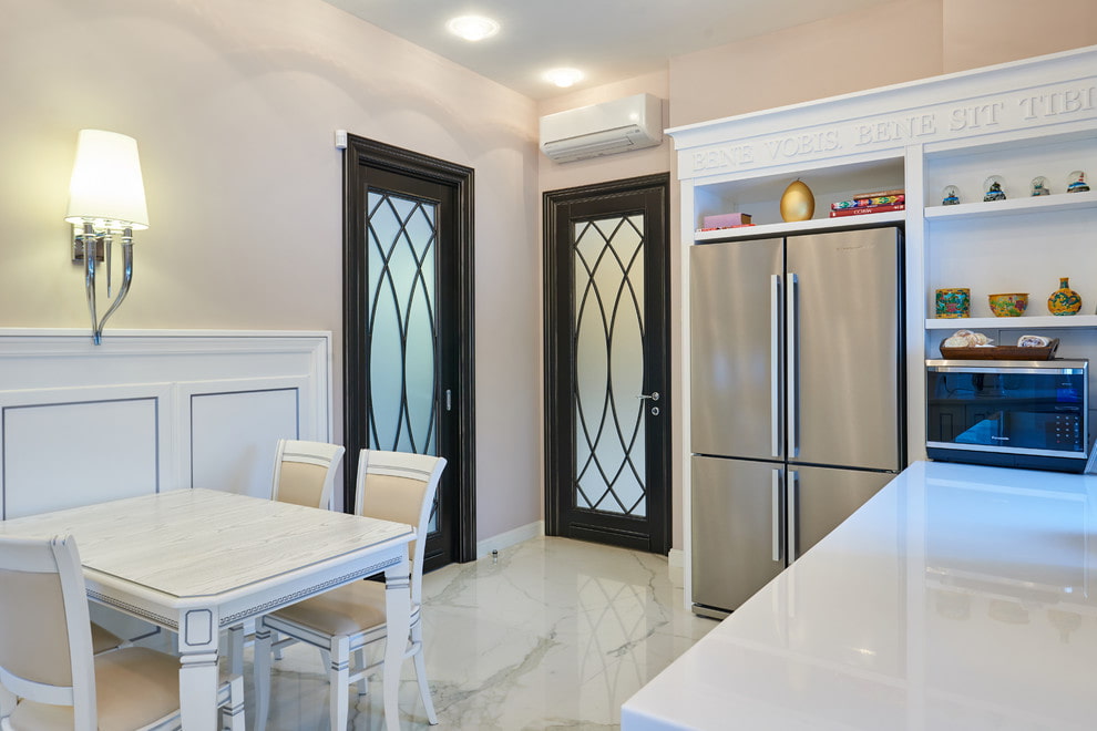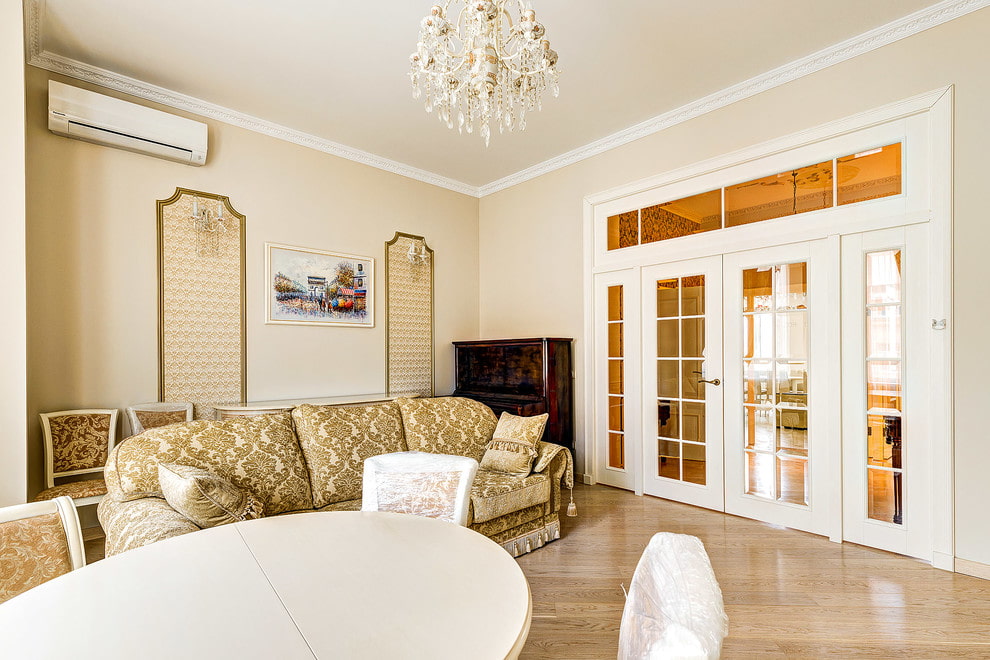- Classical. Interior doors with glass, in the form of imitation of a window with a white frame, canvases in calm beige, white, light brown colors, decorated with symmetrical glass facet inserts with regular lines and simple shapes, will become the visual compositional center of a classic interior.
