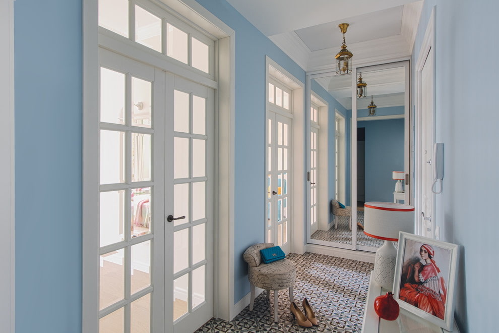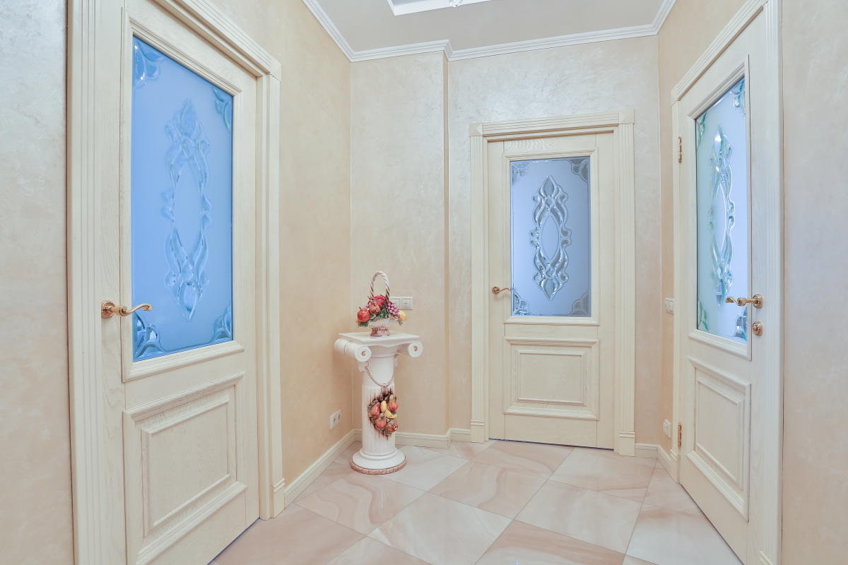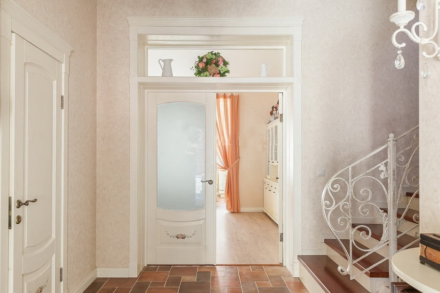 In the photo there are light interior products with matte patterned glazing in the corridor.