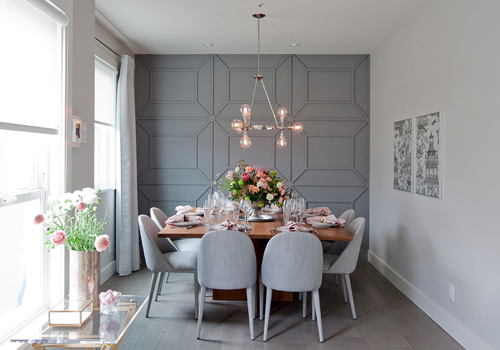 The photo shows an asymmetrical arrangement of wall moldings in a modern interior.