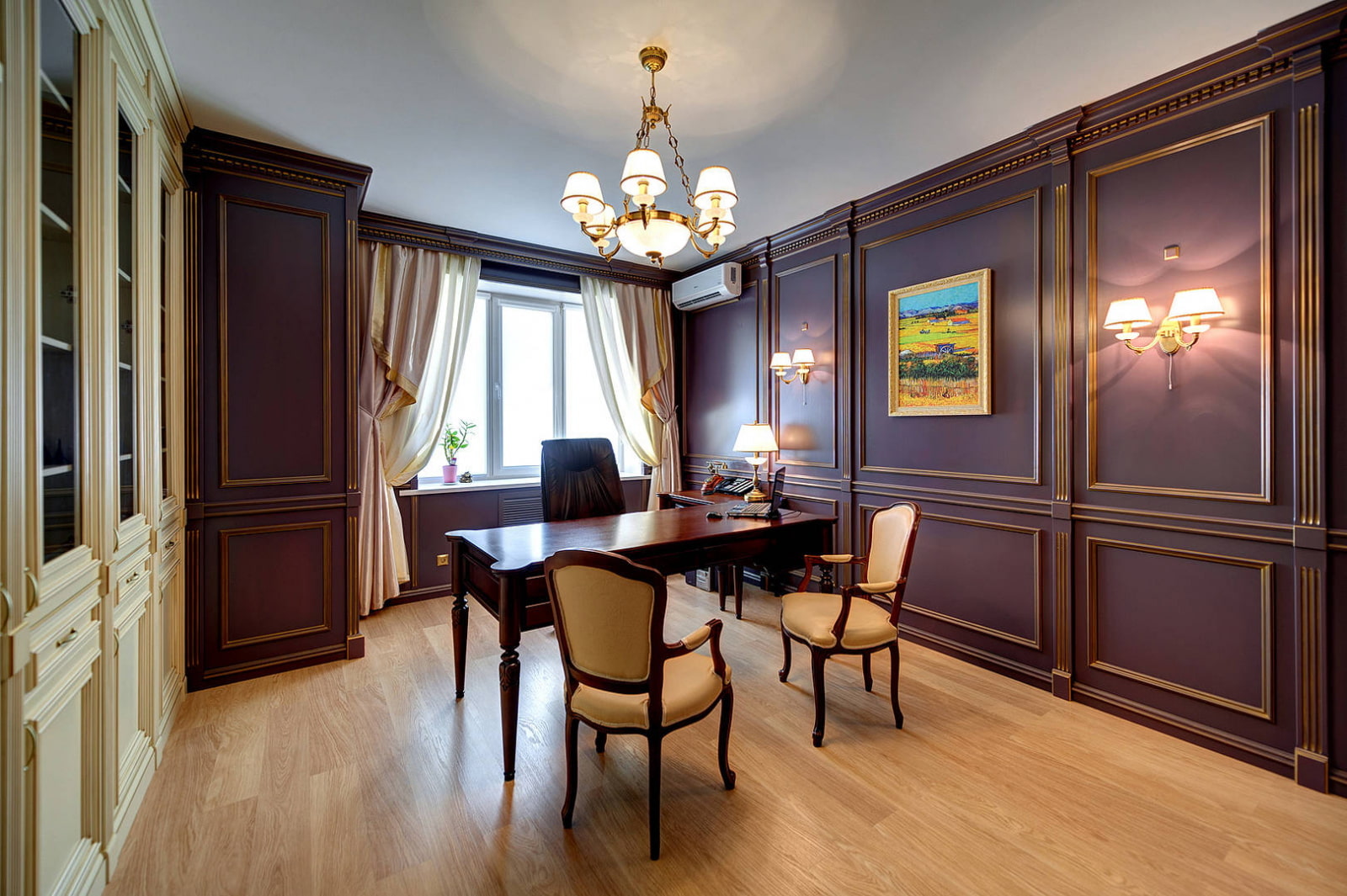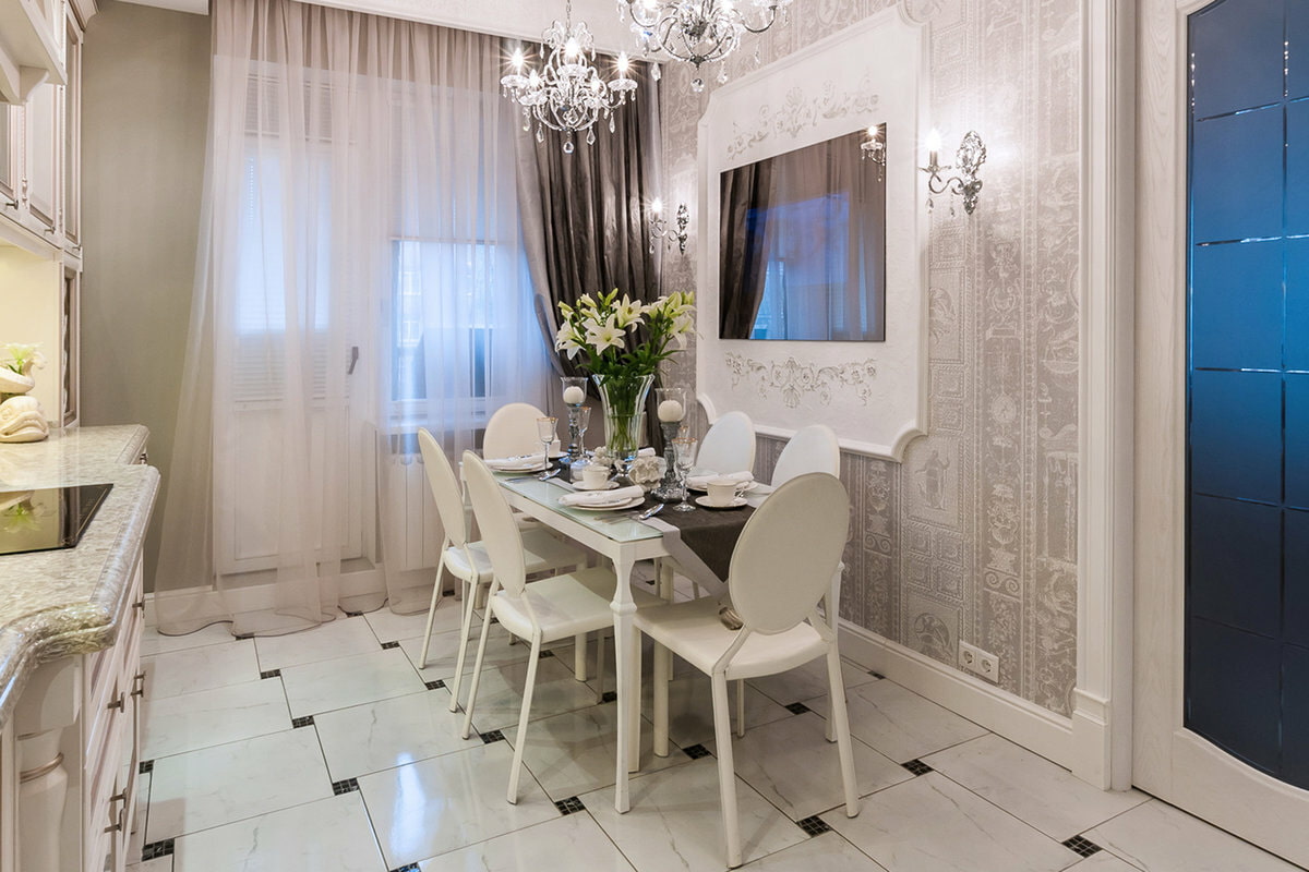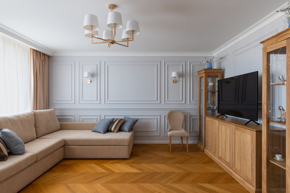 For elegant neoclassicism, moderate decor with wall moldings, characterized by strict geometric shapes and unobtrusive ornaments, is suitable.