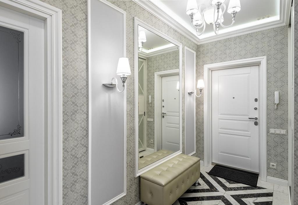 Moldings are most often used to highlight the front door. You can decorate a mirror with wall lamps with relief elements. In a small corridor that does not involve the installation of a cabinet, planks can mark an area with hooks and a clothes hanger.