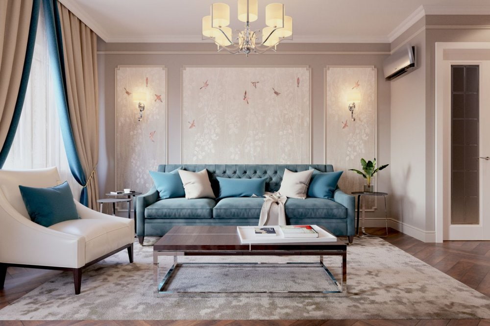 In the photo there is a neoclassical living room with rectangular moldings in the interior for dividing the wallpaper behind the sofa.