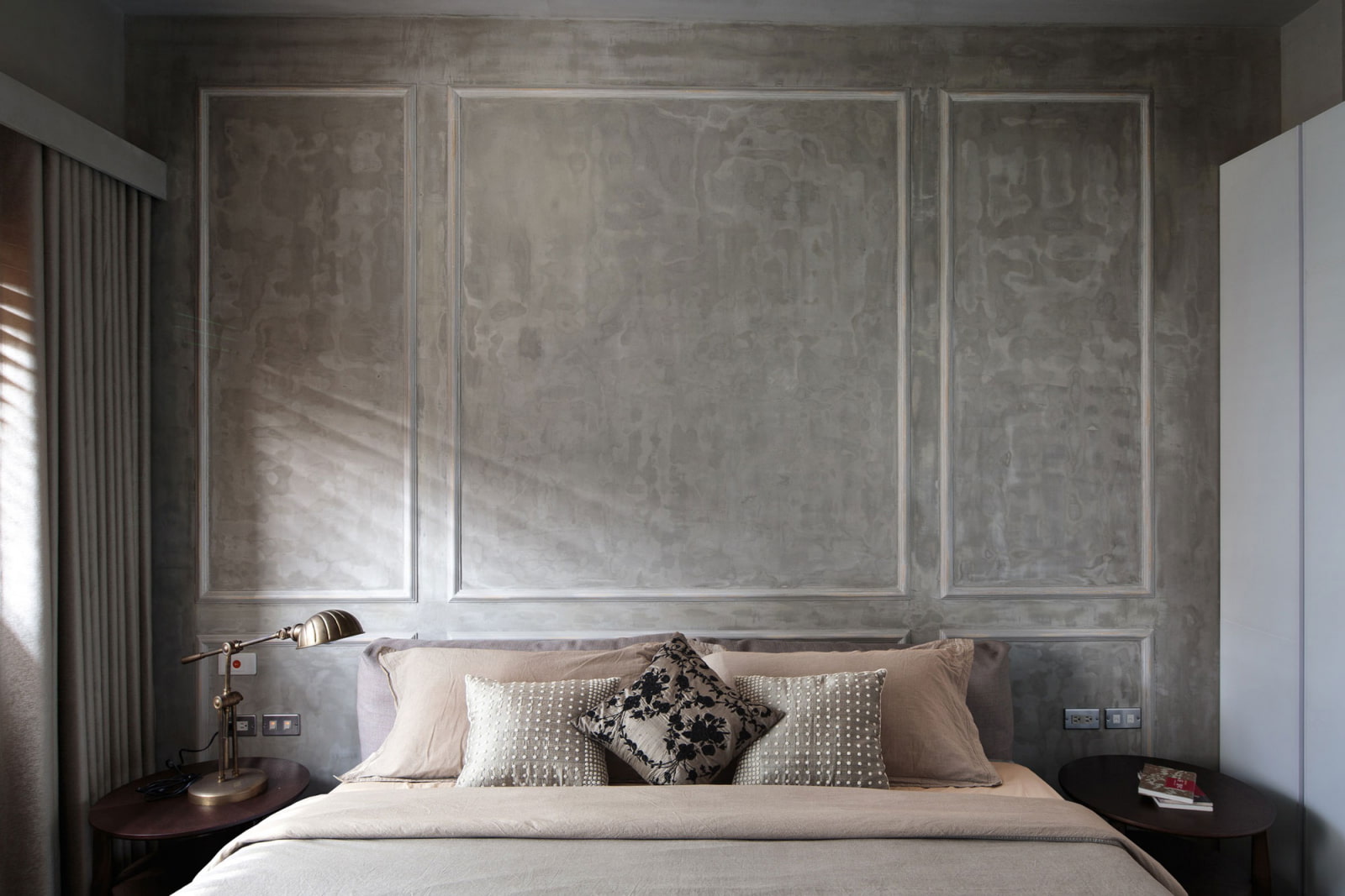 The photo shows the interior of a bedroom with a wall decorated with moldings in the form of a headboard.