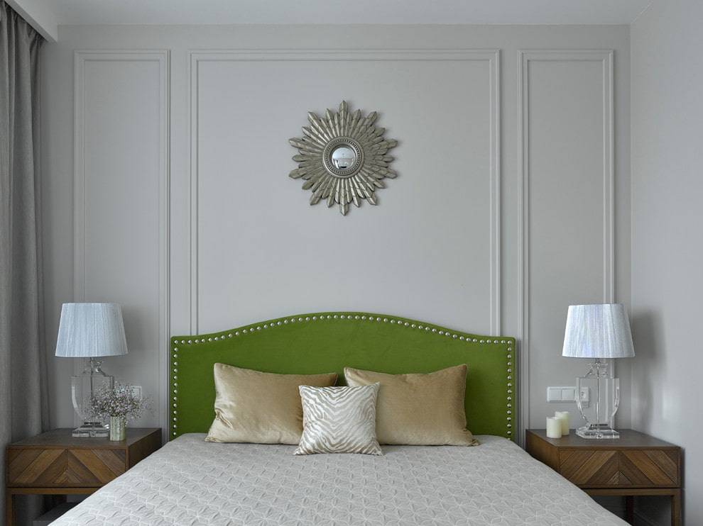A wall with a molding frame that repeats the size of the bed will favorably emphasize the interior composition and the overall design concept.