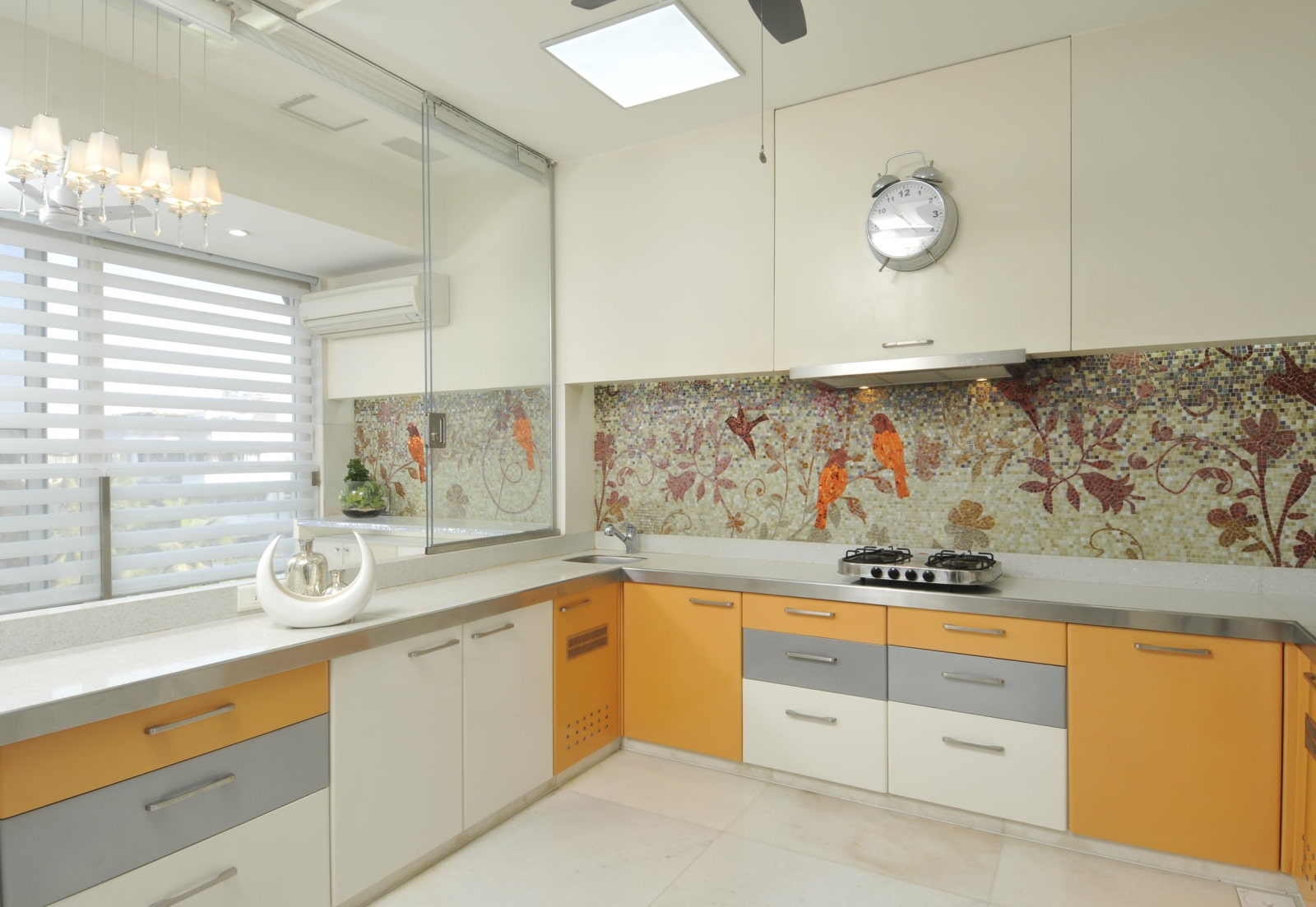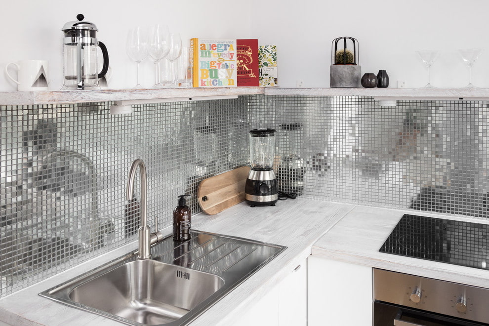 In the photo there is a working area decorated with silver-colored mosaics in the interior of the kitchen.