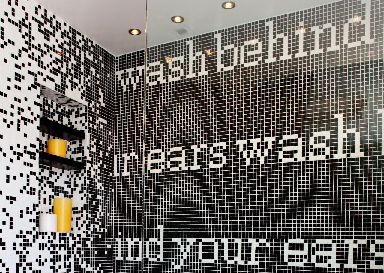 The photo shows mosaic geometric shapes on an accent wall in the interior of the toilet.