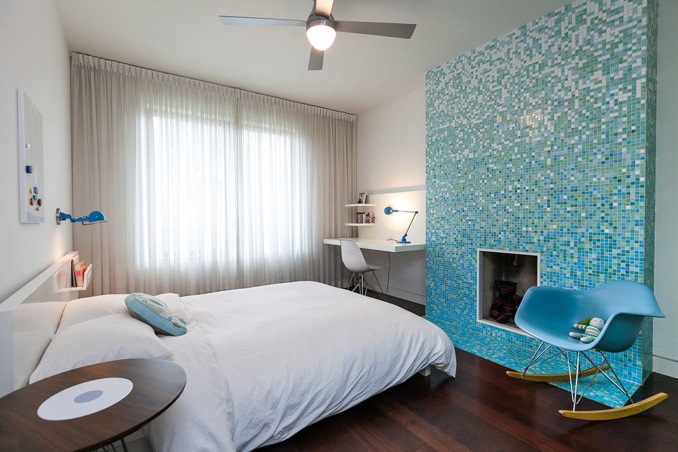 For the bedroom, various panels are used that fill the space with a mysterious shimmer, mosaics in silver, gold, beige, blue, olive and other pastel colors, wood or coconut tiles, which are used both as an accent and combined with different materials, such as wallpaper.