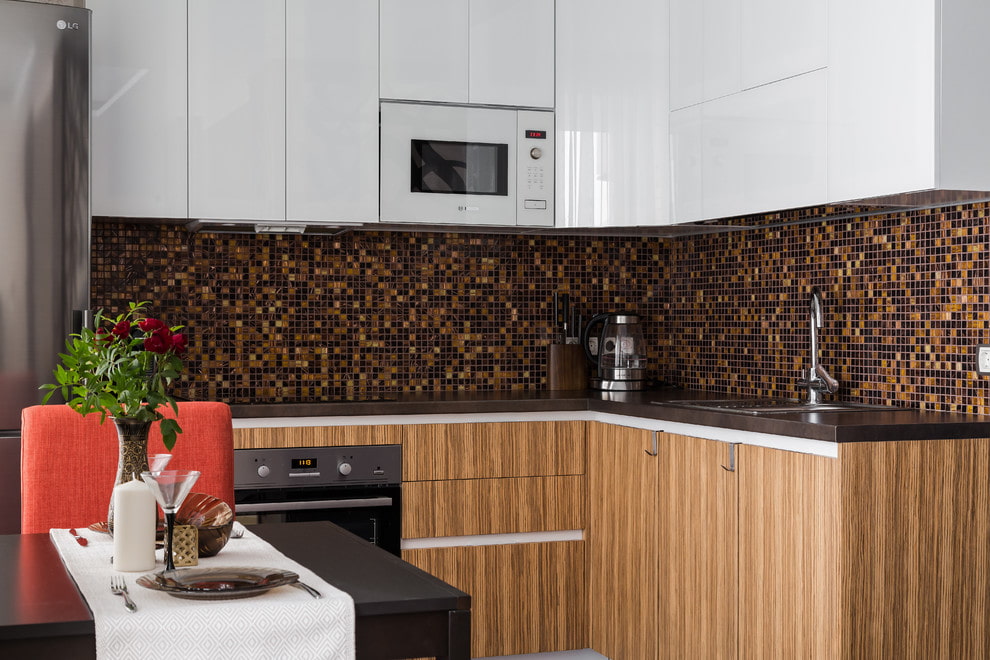 Such a kitchen apron, consisting of many fragments, looks very expressive and undoubtedly becomes an adornment of the entire interior.