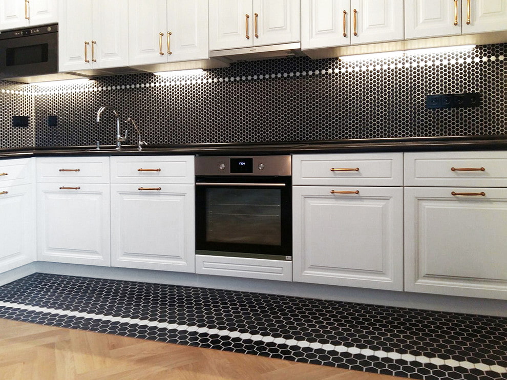 The photo shows a mosaic in the form of hexagons in the design of an apron in the interior of a modern kitchen.