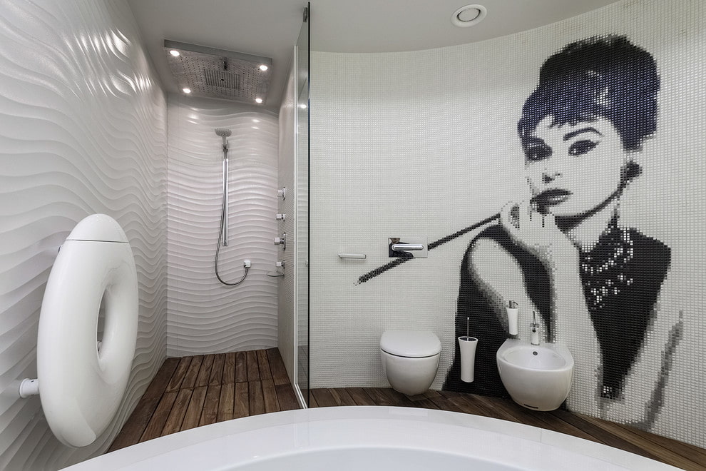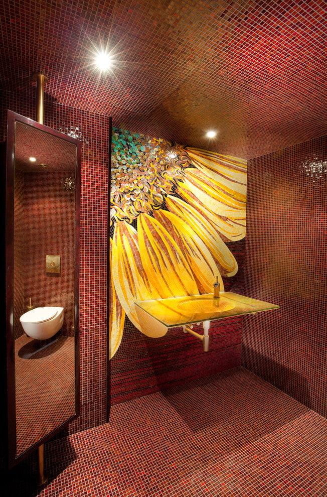 For decoration, a variety of types of mosaics are used, which can have a monochromatic, matte, glossy finish, represent decorative patterns or patterns and decorate, both all walls in the room, and only one.