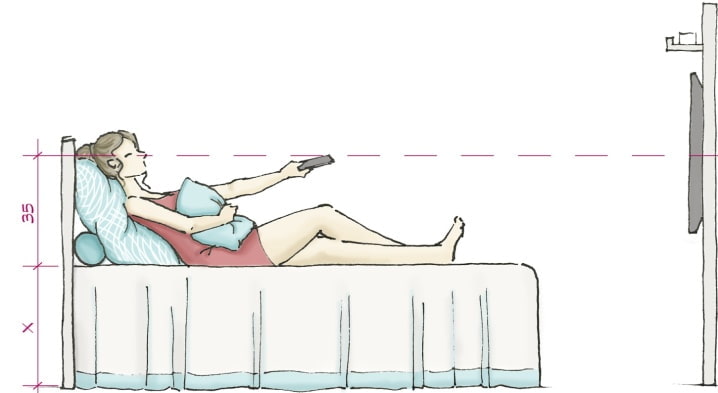How and at what height to hang a TV with such a matrix? To answer the question, decide on a comfortable position in bed. Then measure the distance from the floor covering to the pupils - the resulting figure will show where the middle of the plasma window should be.