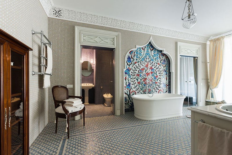 In the photo there is a bathroom with bright decorative elements in the form of a wall panel and patterned platbands.