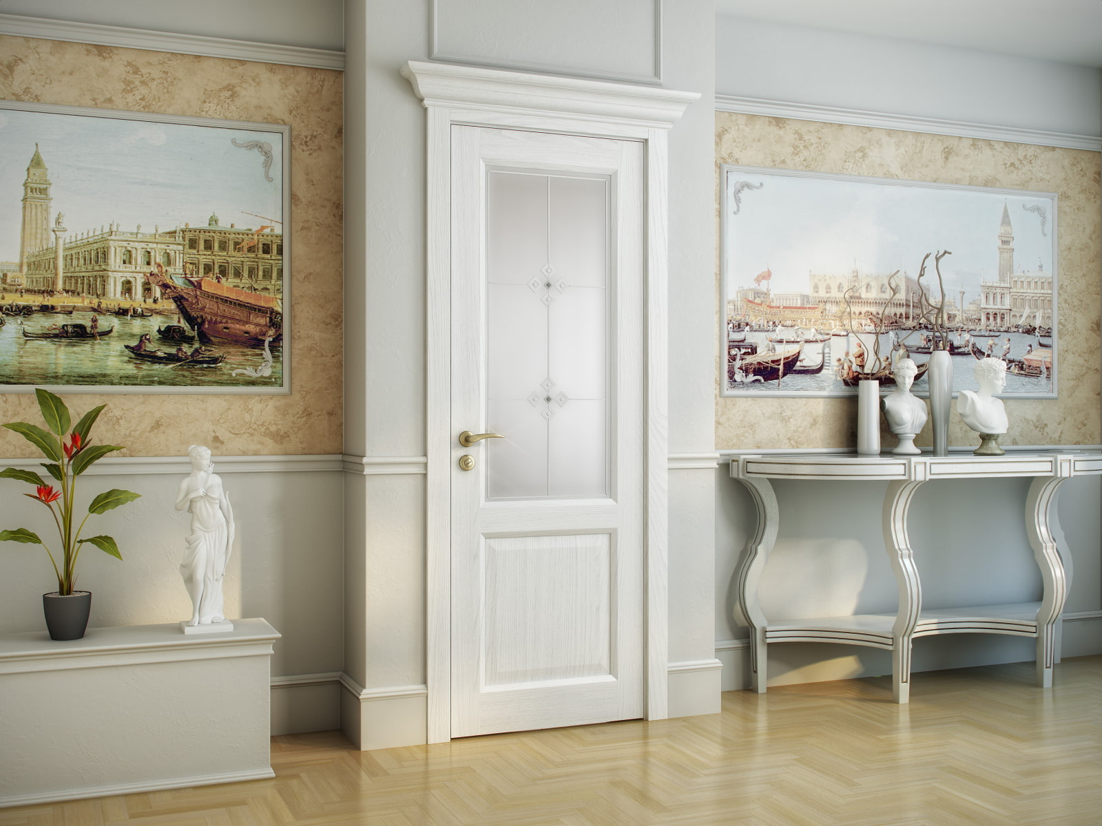 The photo shows a classic-style corridor. Doors and trims form a single ensemble.