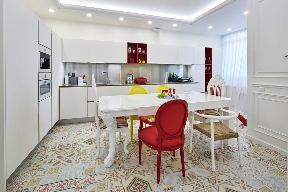 In the photo there is a kitchen in light colors, decorated with floor tiles with multi-colored patterns.