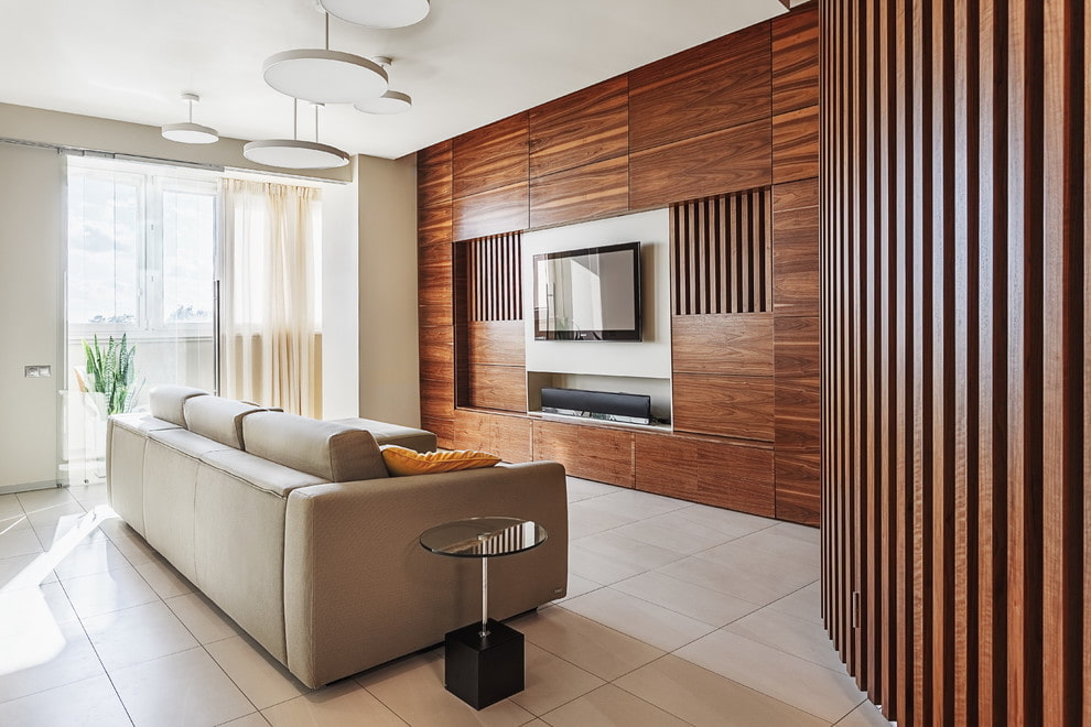 The photo shows the interior of a modern living room with rectangular floor tiles in a light shade.