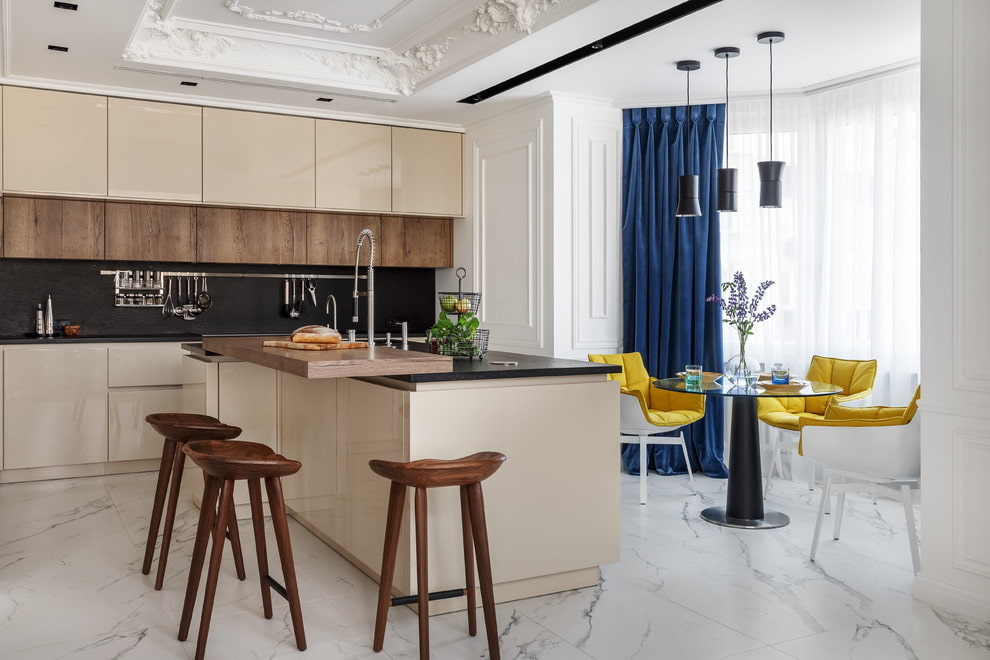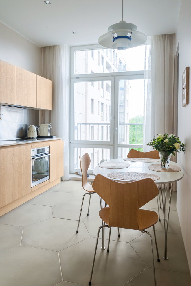 Floor tiles blend seamlessly into the interior and blend perfectly with ceilings and kitchen furniture. The main thing is that the style solution is uniform and harmonious.