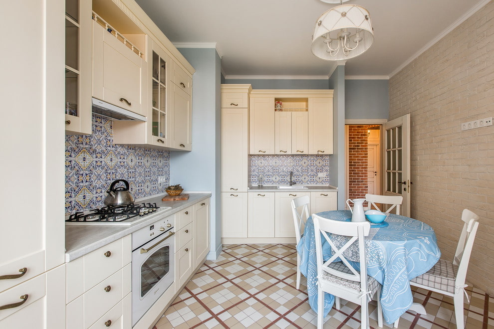 In the photo there is a Provence-style kitchen decorated with a light-colored tiled floor.