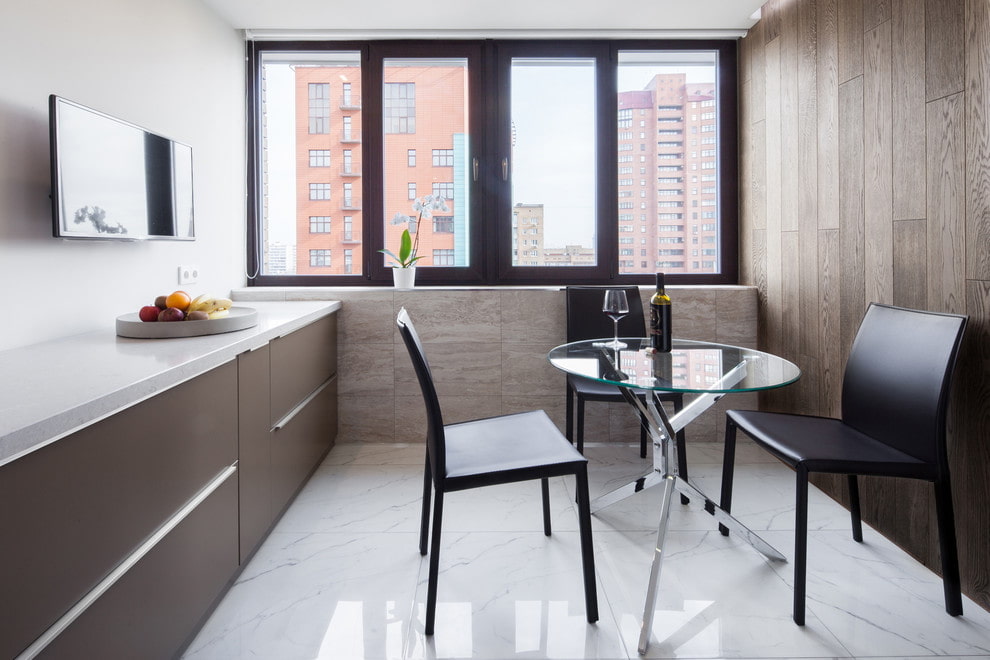 In the photo there is a tiled floor cladding with imitation of white marble in the interior of the kitchen.
