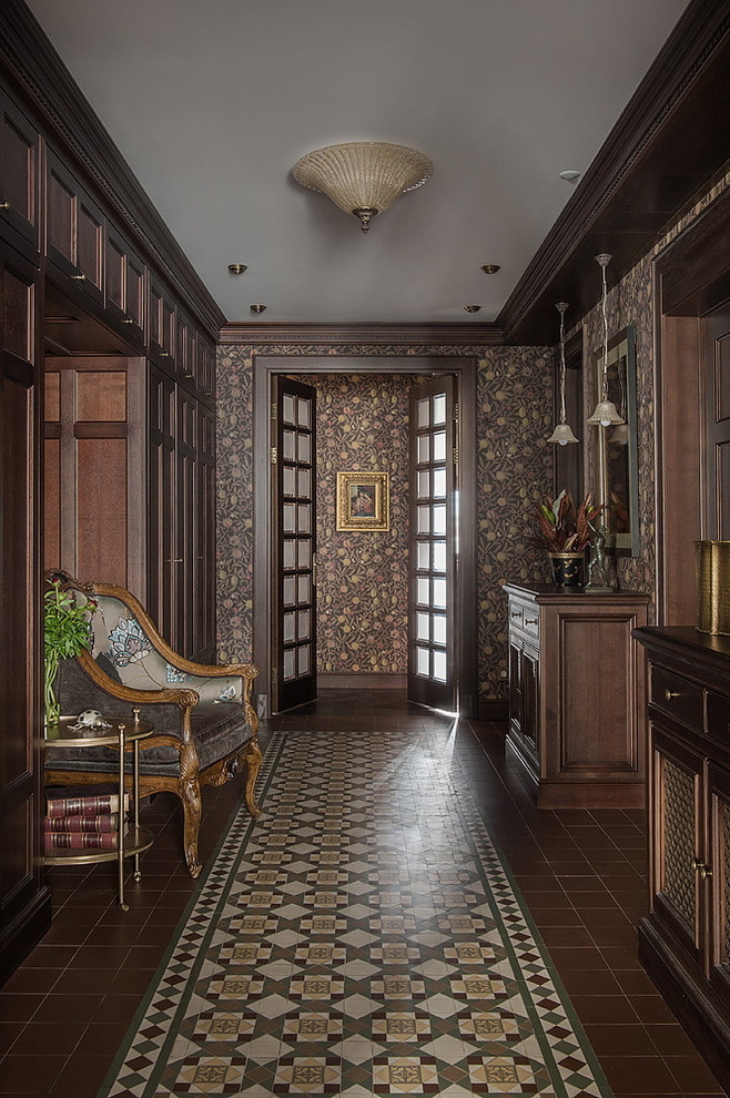 Clinker or porcelain stoneware is especially typical for antique English furnishings. Here, they choose products with an original decor and texture, or use a solution that is quite popular for this style, in the form of a two-color checkerboard layout.