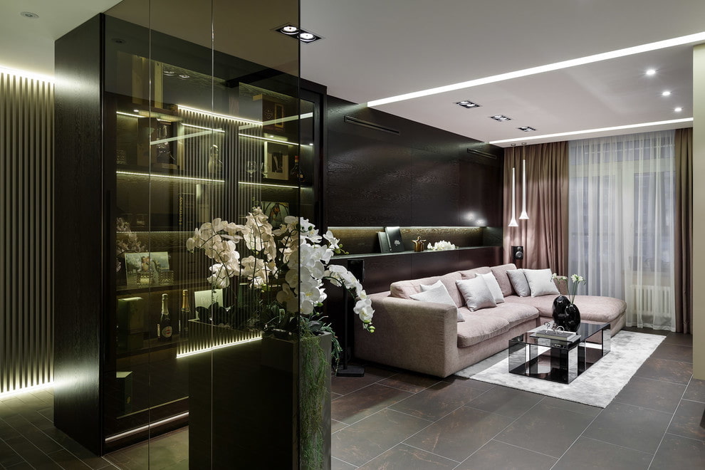 To create a more luxurious and respectable living room design, marble-like flooring or no less spectacular cladding with imitation of laminate or parquet is used, outwardly indistinguishable from an analogue.