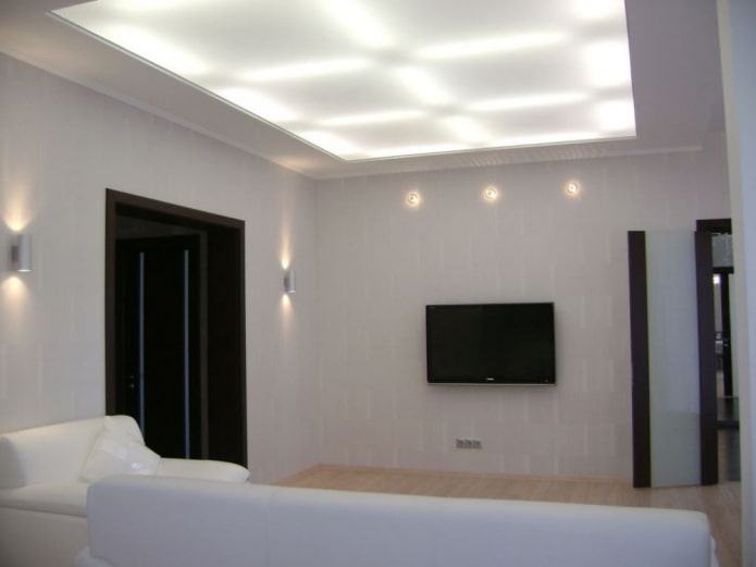 Plasterboard and tension models are often decorated with various illumination, which can be located in a niche or along the perimeter of the protruding part of the structure.
