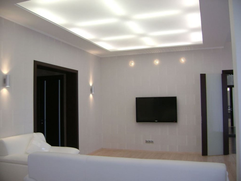 The option with illumination through the canvas looks advantageous - a small room with such illumination will visually increase, and in a spacious one, a cozy atmosphere will be created due to the soft diffusion of light.