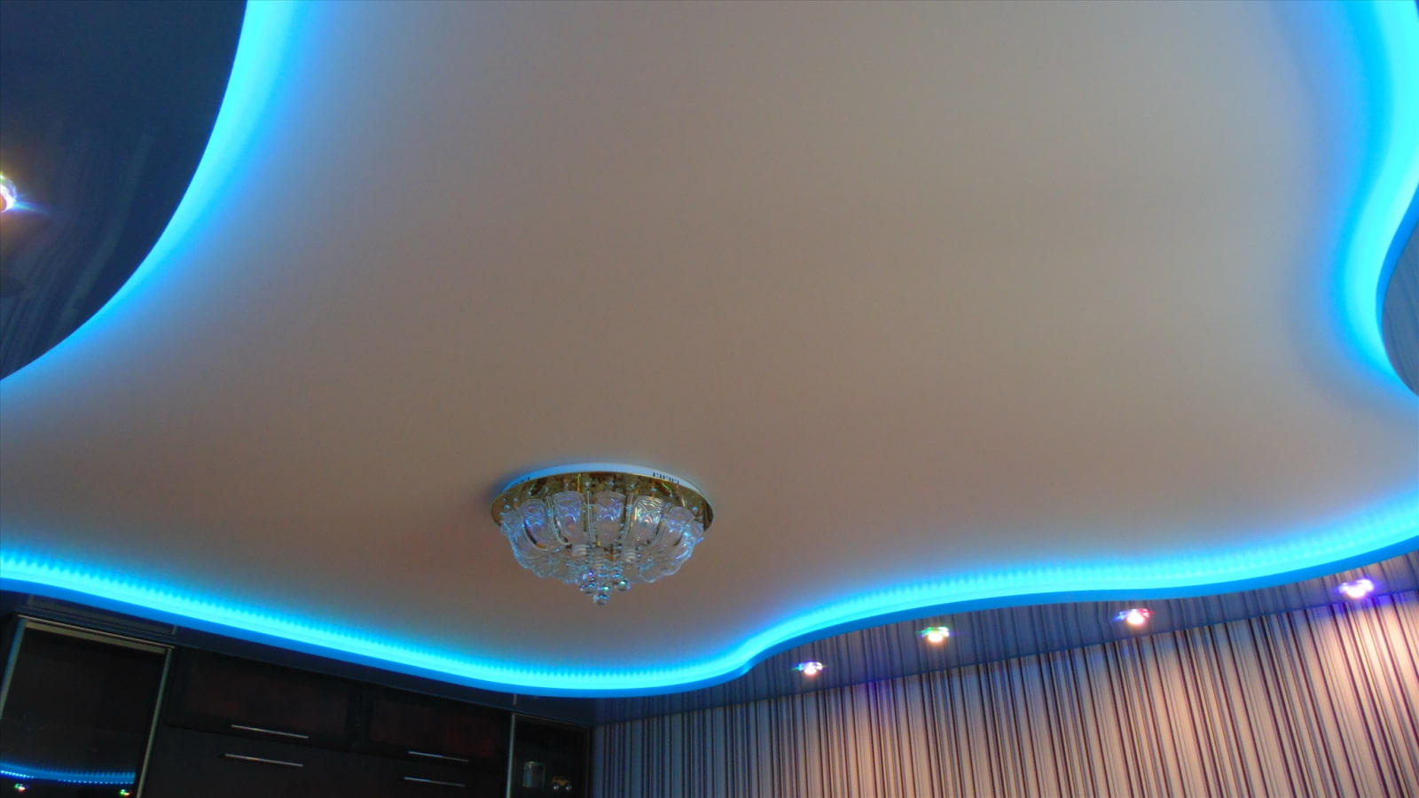 The illumination around the perimeter of the ceiling structure visually expands the space of the room, and, if necessary, serves for zoning the room. To create a special atmosphere, they use blue, purple, green and other unusual shades of lighting.