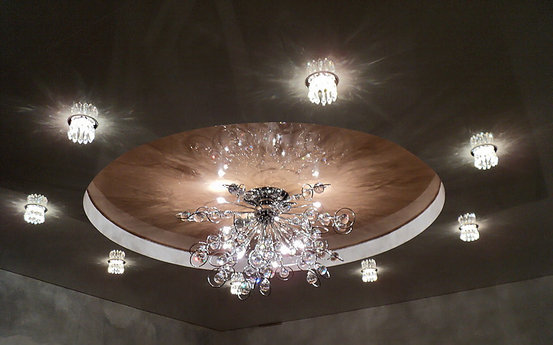 There are many lighting options that are used when installing stretch ceilings. Among them are built-in spotlights, mini-diode lamps, spots, chandeliers, as well as lights around the edges and from the inside. When choosing a lighting system, there is a limitation - the canvas should not overheat during use.