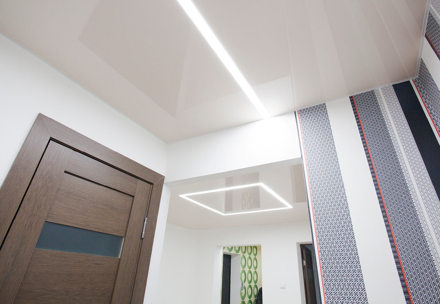 In the photo there is a two-level ceiling in white and beige. The alternation of glossy and matte textures gives the interior dynamism.